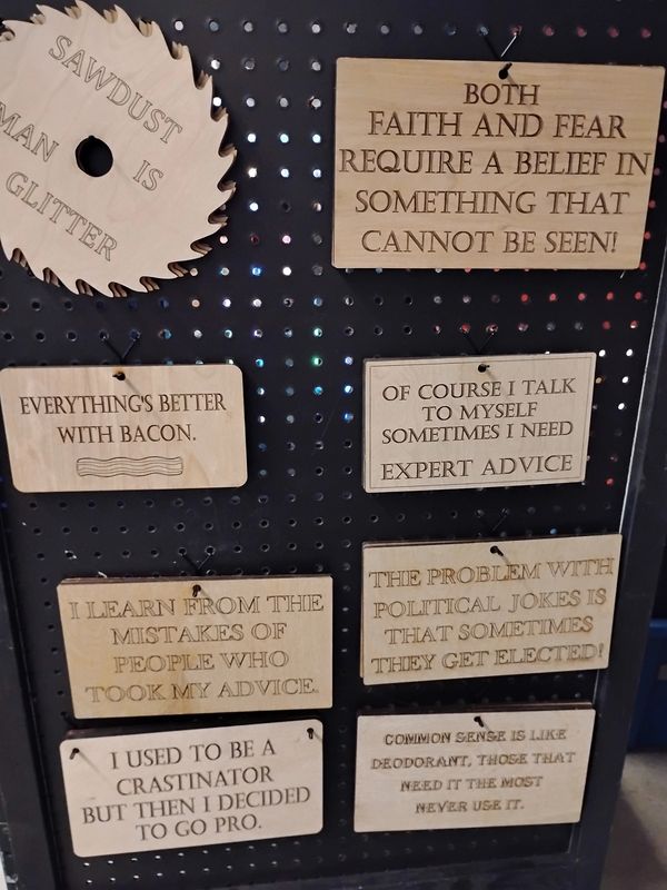 Add a bit of humor or inspiration to your life with a laser engraved wood sign. Each sign is designed to bring a chuckle or a reminder of hope to your day.